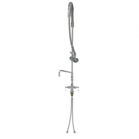 | Engineering Spec: | Single hole deck mount mixing faucet with polished chrome plated brass body, add-on faucet with compression cartridge with spring check and lever handle, 12 swing nozzle with stream regulator outlet, 24 riser, 44 flexible stainless steel hose with heat resistant handle, 1.15 GPM spray valve, compression cartridges with spring checks, lever handles, 18 flexible stainless steel supply hoses with 1/2 NPSM / 5/8 O.D. compression connections, 6 adjustable wall bracket, spray valve holder, accessory tee and overhead spring. Certified to ASME A112.18.1/CSA B125.1, NSF 61-Section 9 and NSF 372. 2019 DOE PRSV - Class II compliant. |