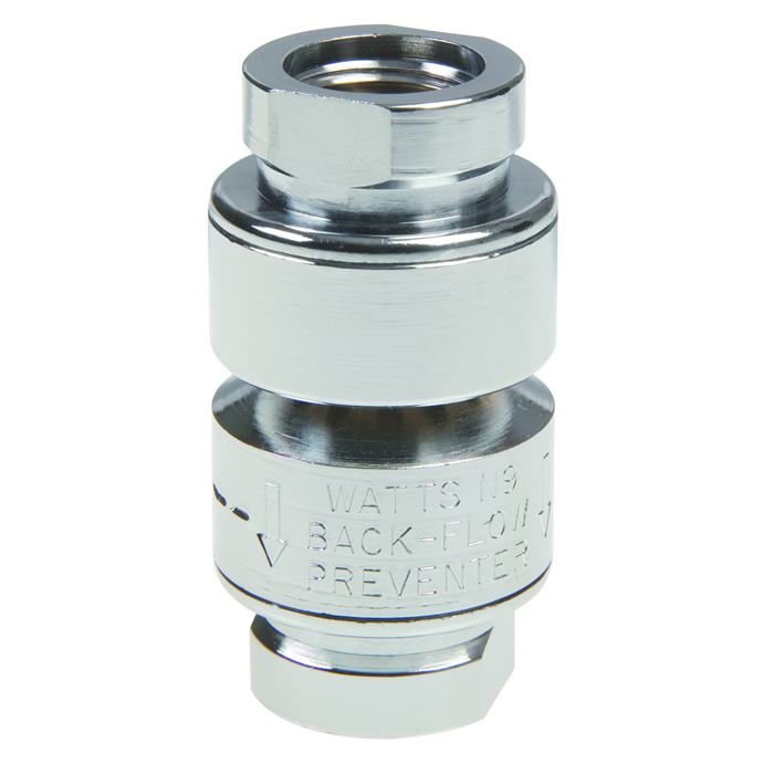 Engineering Spec: | In-line continuous pressure dual check vacuum breaker with intermediate vent, polished chrome plated brass body, 3/8 NPT female inlet and outlet. Certified to ASME A112.18.1/CSA B125.1, NSF 61-Section 9, NSF 372 and CSA B64.8. |