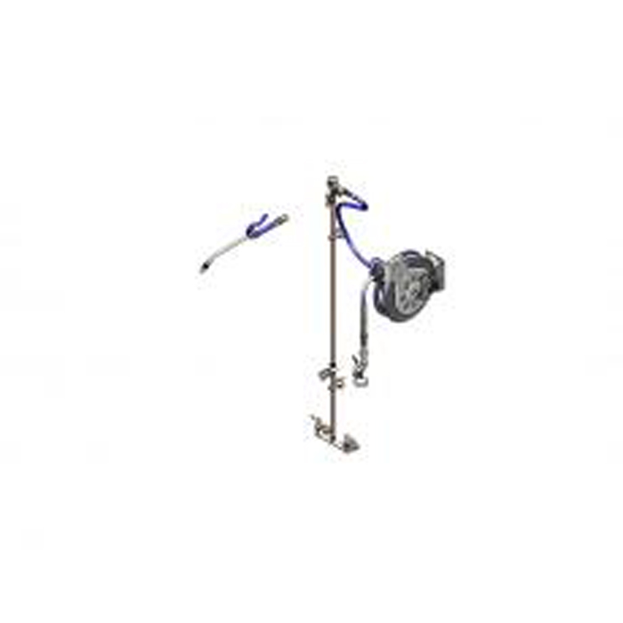 | Engineering Spec: | 8 wall mount mixing faucet with polished chrome plated brass body, ceramic cartridges with check valves, lever handles, 1/2 NPT female inlets, 16 riser, control valve, 40 riser, wall brackets, continuous pressure vacuum breaker, 36 flexible water hose connector with stainless steel quick disconnect, open coated hose reel with 3/8 x 35' heavy-duty non-marking hose, ratcheting system, 1.15 GPM spray valve with quick disconnect and extended wand spray valve with quick disconnect, multi-fit bracket and adjustable hose bumper. Certified to ASSE 1056. 2019 DOE PRSV - Class II compliant. |
