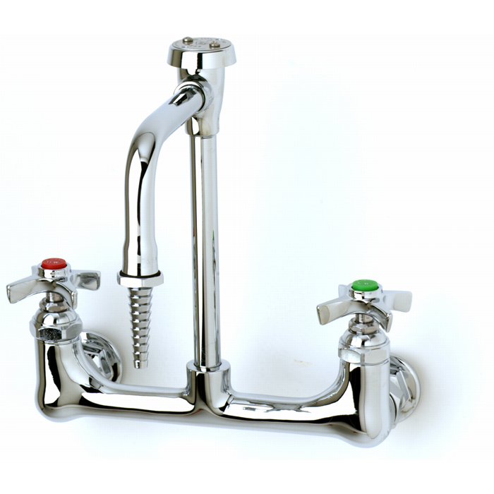| Engineering Spec: | 8 wall mount mixing faucet with polished chrome plated brass body, 6 riser, polished chrome plated swivel/rigid nozzle with vacuum breaker and serrated tip outlet with 0.5 GPM flow control, compression cartridges with spring checks, 4-arm handles and 1/2 NPT female inlets. Certified to ASME A112.18.1/CSA B125.1, NSF 61-Section 9, NSF 372 and ASSE 1001. Meets ADA ANSI/ICC A117.1 requirements. |