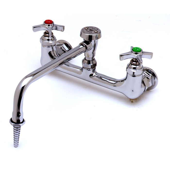 | Engineering Spec: | 8 wall mount mixing faucet with polished chrome plated brass body, polished chrome plated swivel nozzle with vacuum breaker and serrated tip outlet with 0.5 GPM flow control, compression cartridges with spring checks, 4-arm handles and 1/2 NPT female inlets. Certified to ASME A112.18.1/CSA B125.1, NSF 61-Section 9, NSF 372 and ASSE 1001. Meets ADA ANSI/ICC A117.1 requirements. |